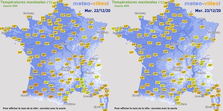 Températures maximales les mardi 22 et mercredi 23 décembre 2020 - Météo Paris
