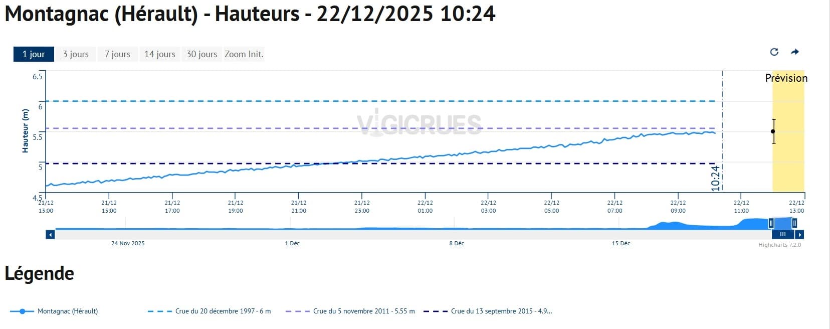 Évolution du niveau de l'Hérault à la station de Montagnac (34) – Vigicrues