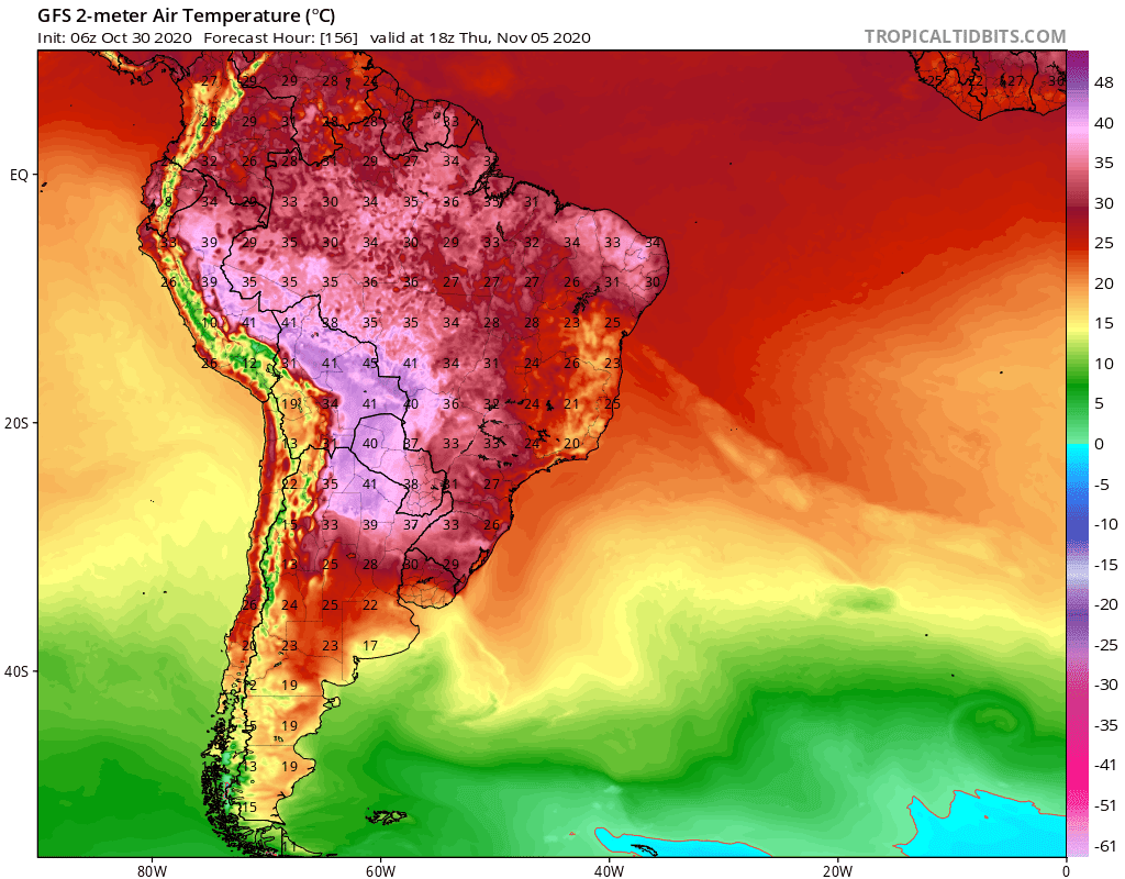 Sur le Sud du continent l’été s’installe peu à peu avec des températures toujours exceptionnellement élevées pour la saison sur le centre de la région. Les 45°C pourraient être atteints dans les prochains jours entre le Sud-Ouest du Brésil  et la Bolivie.
