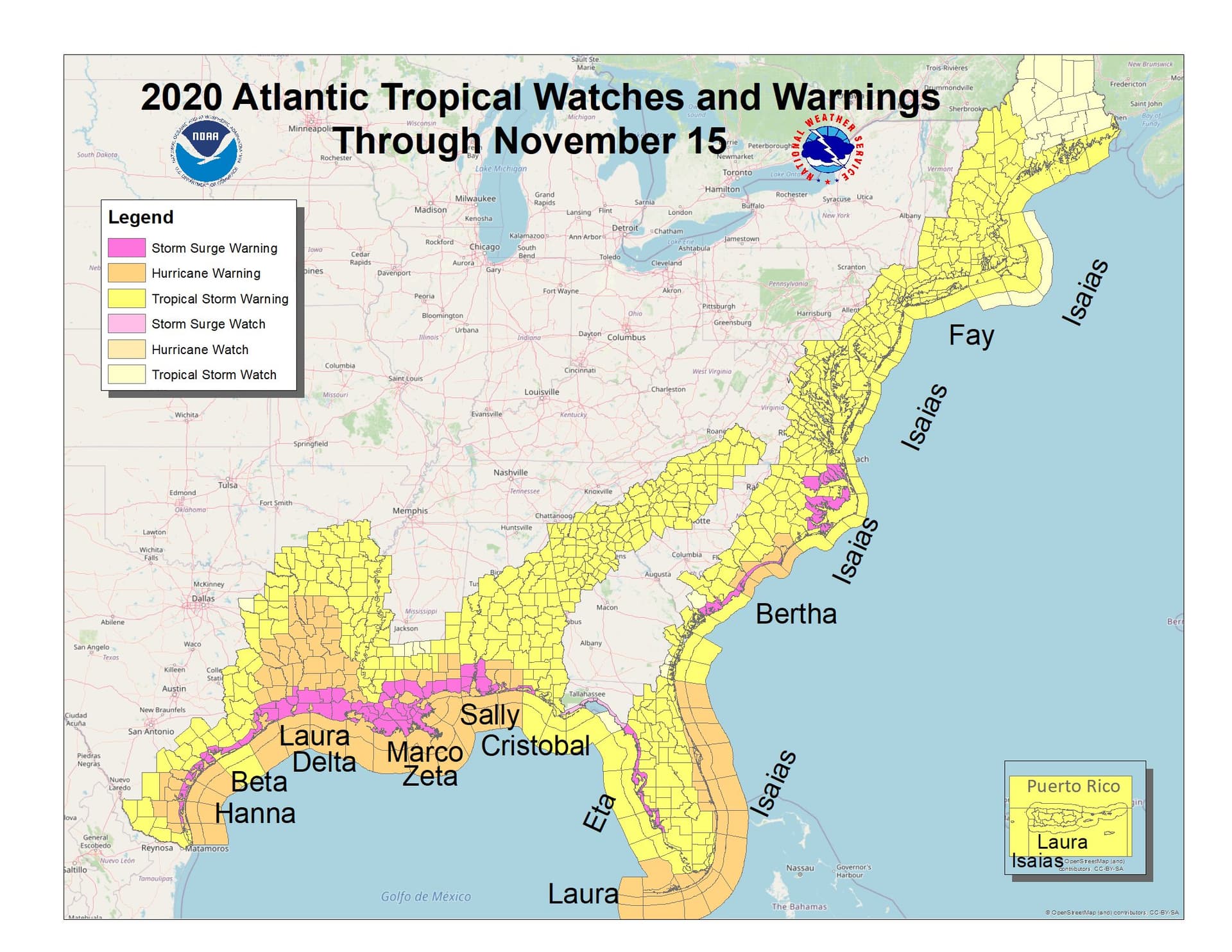 Superposition des alertes cycloniques durant la saison 2020 aux Etats-Unis - via National Weather Service