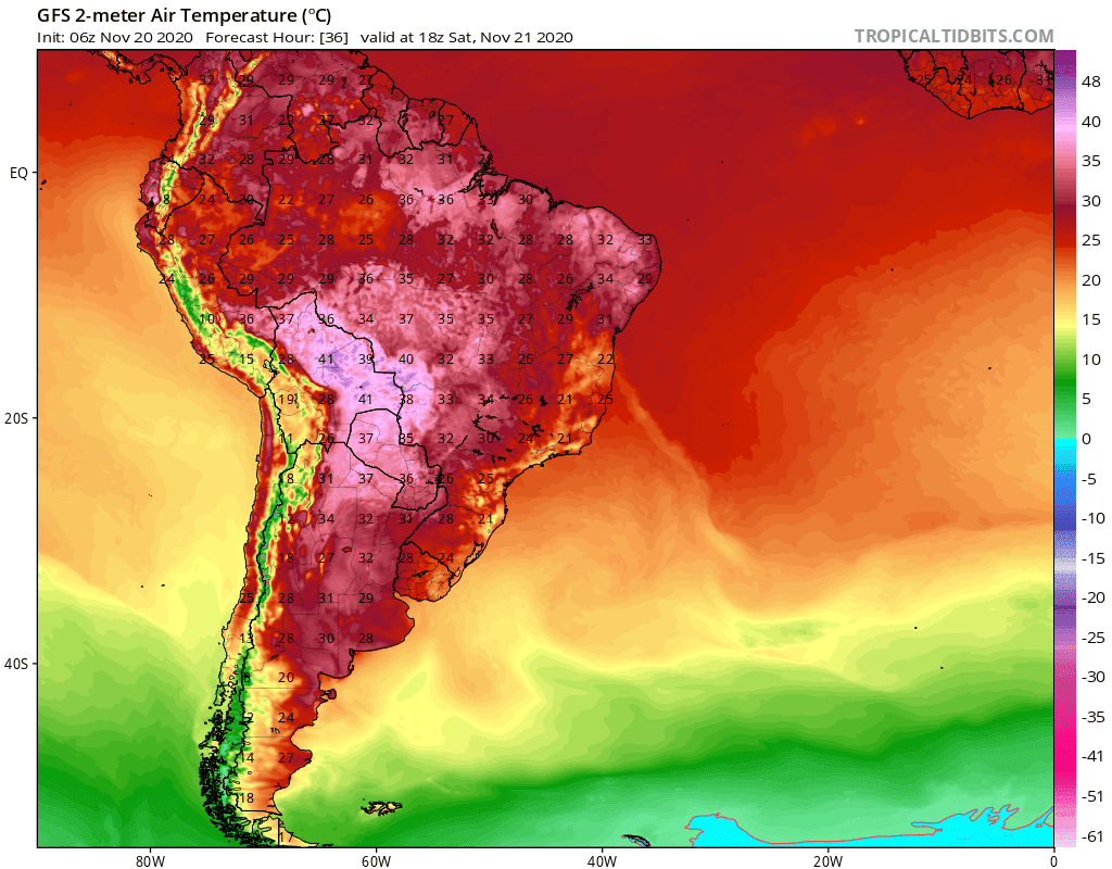 Températures maximales prévues sur le Sud du continent américain en journée du 21 novembre - via tropicaltidbits.com