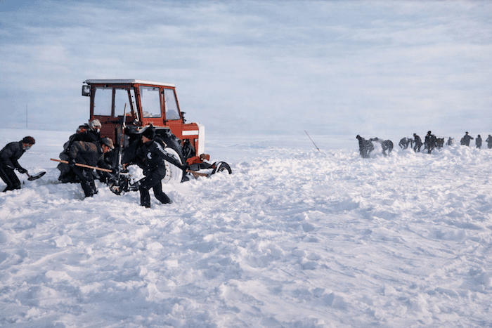 5 janvier 1979 : La population est les militaires tente de dégager un tracteur dans les plaines de la Beauce en plein blizzard - photo colorisée - Le Pli d'Etampes