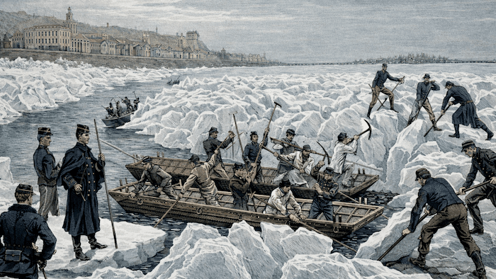 Après un mois de décembre 1879 glacial, les grands fleuves français sont figés dans la glace. Un redoux spectaculaire survient début 1880. La débâcle rapide provoque des dégâts considérables et fait s'effondrer des ponts.