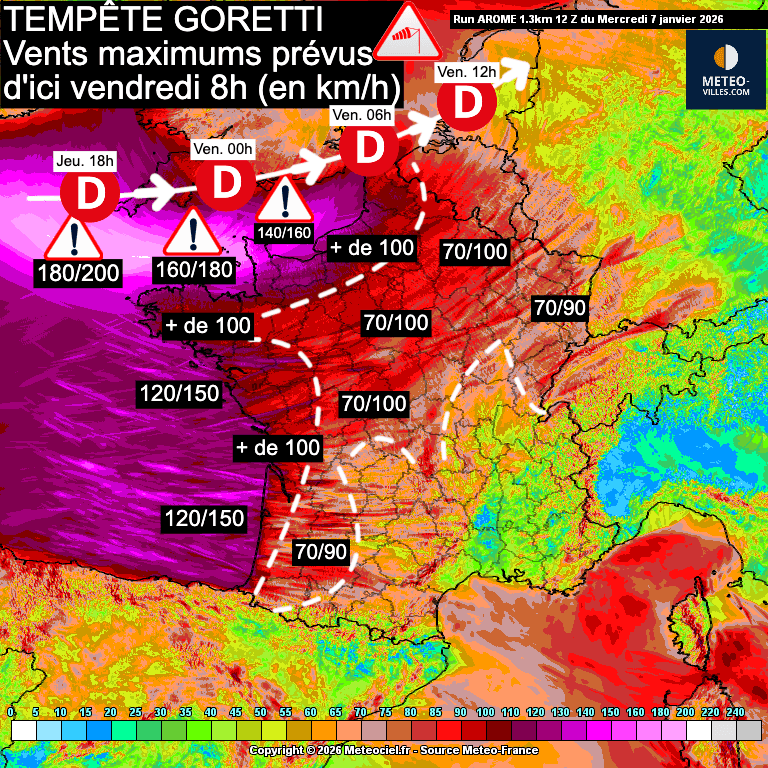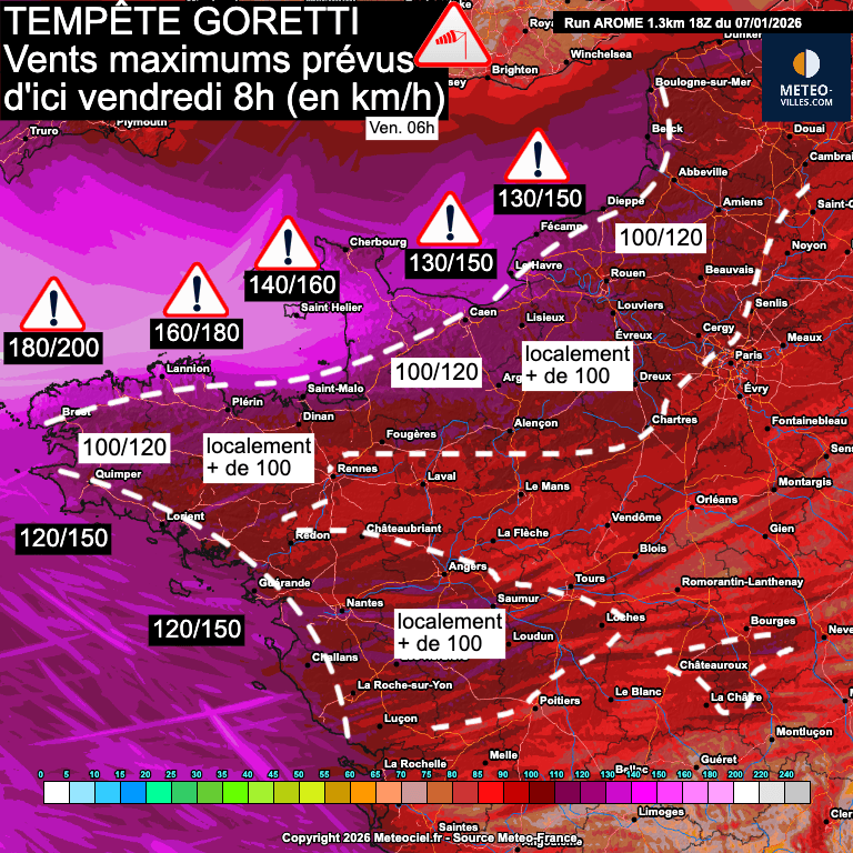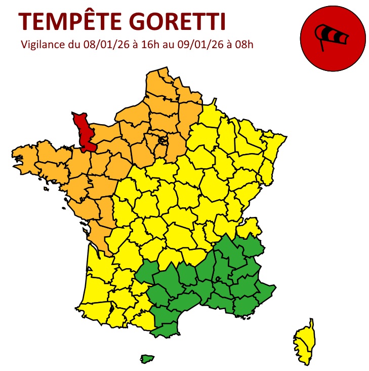Depuis jeudi 6h, Météo-France a d'ailleurs placé le nord-ouest de la France en vigilance orange tempête et le département de la Manche en vigilance ROUGE pour ce soir du jeudi 8 janvier 2026 et la nuit prochaine !