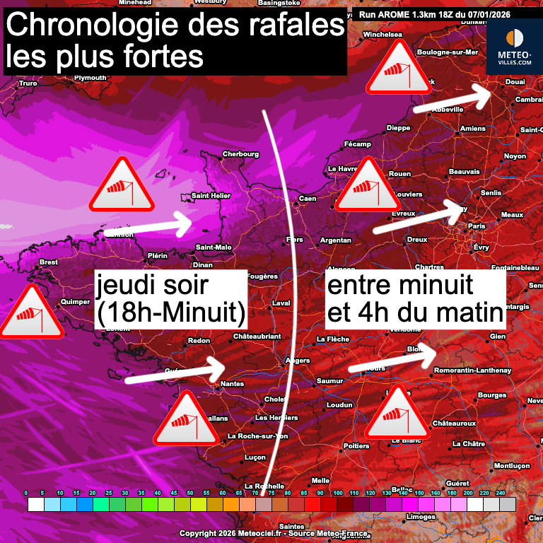 Cette tempête fera rage sur la Bretagne, le Cotentin et les Pays de la Loire dès la soirée de jeudi, puis elle secouera le reste de la Normandie, les Hauts-de-France, l'Île-de-France, le Centre et le reste des Pays-de-la-Loire entre minuit et 4h du matin (fort heureusement à un moment de la journée les gens sont généralement chez eux).