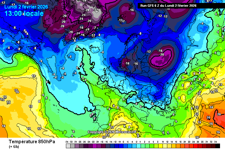 Animation des températures à 850 hPa sur l'Europe jusqu'au 7 février 2026 – via meteociel.fr
