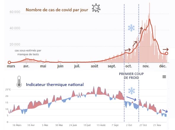 Cette évolution suit une logique comportementale de l'être humain : plus il fait froid et plus on passe de temps dans des lieux clos. De même, plus les températures sont basses et moins on ouvre les fenêtres. Ces habitudes hivernales font le bonheur des virus respiratoires dont la transmission aéroportée est démontrée. Un repas de famille en intérieur comporte bien plus de risques que dans un jardin où l'air est brassé - or il est compliqué de déjeuner ou de dîner en extérieur à cette époque de l'année...