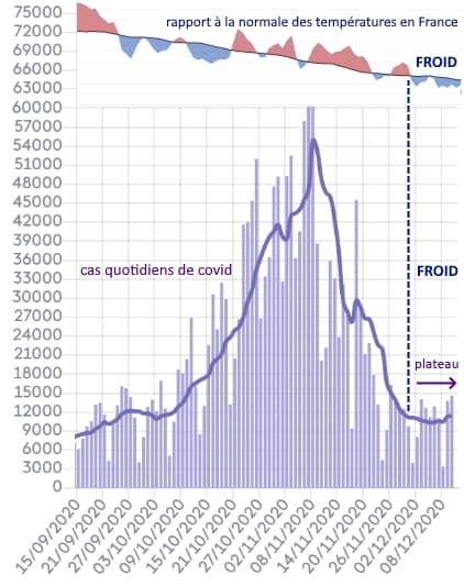 Là où le parallèle entre températures et circulation du virus est intéressant, c'est que l'arrivée de températures froides et hivernales à la toute fin du mois de novembre semble avoir eu un impact négatif sur la baisse du nombre de cas de covid-19. On constate en effet que le coup de froid des derniers jours a enrayé la baisse du nombre de cas avec l'observation d'un plateau (ni augmentation, ni diminution). Il faut toutefois rester prudent sur les origines climatiques car l'allègement du confinement joue probablement aussi un rôle dans cette tendance négative.