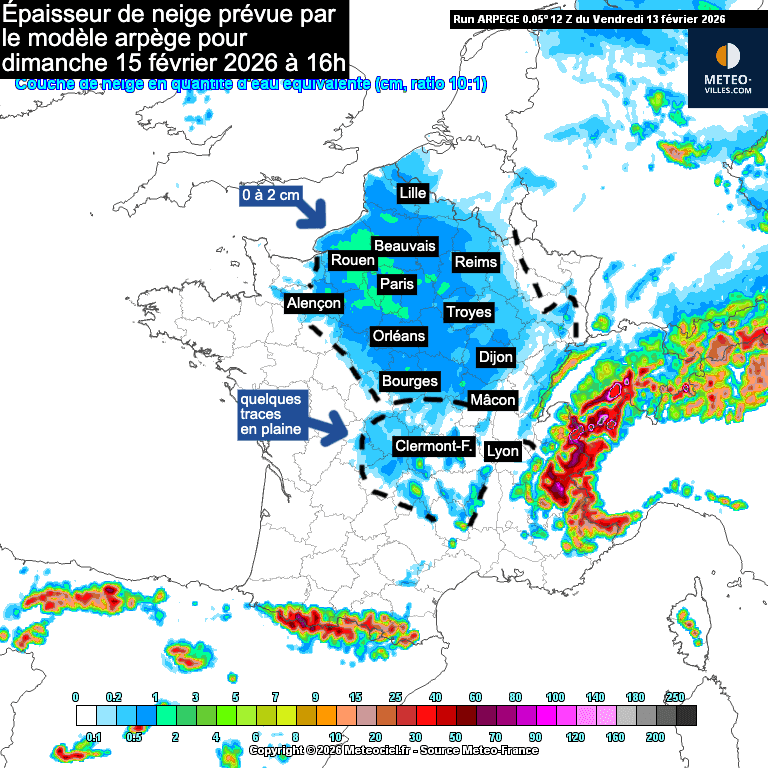 Simulation de l'épaisseur de neige prévue pour dimanche 15 février par le modèles météo ARPÈGE (français) - Meteociel