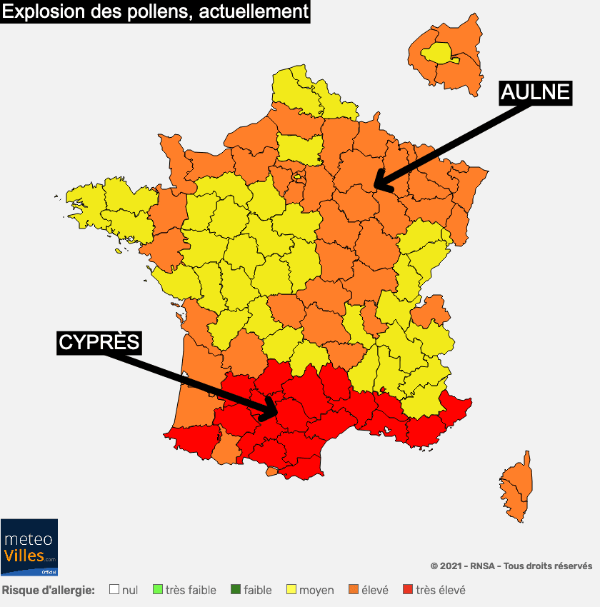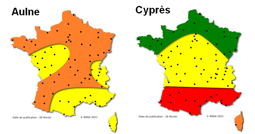 De ce fait, tout le pays sans exception sera concerné par les pollens pour le début du mois de mars, avec des concentrations plus élevées d’aulnes sur le Nord du pays et de cyprès (très allergisants) sur le Sud.