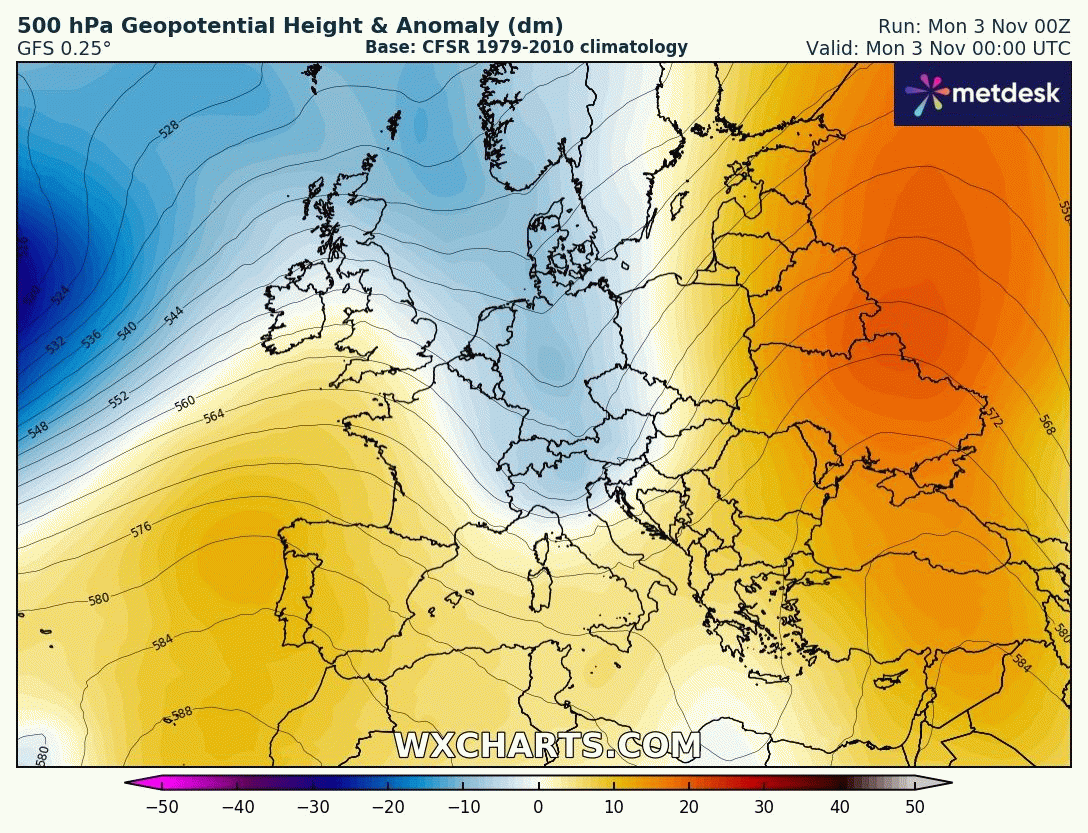 Évolution des anomalies de géopotentiels à 500 hPa sur la France du 3 au 9 novembre 2025 – Modèle GFS via WX CHARTS