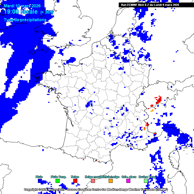 Évolution des vagues pluvieuses (en bleu) et neigeuses (en rouge) prévu jusqu'à dimanche matin par le modèle METEO européen
