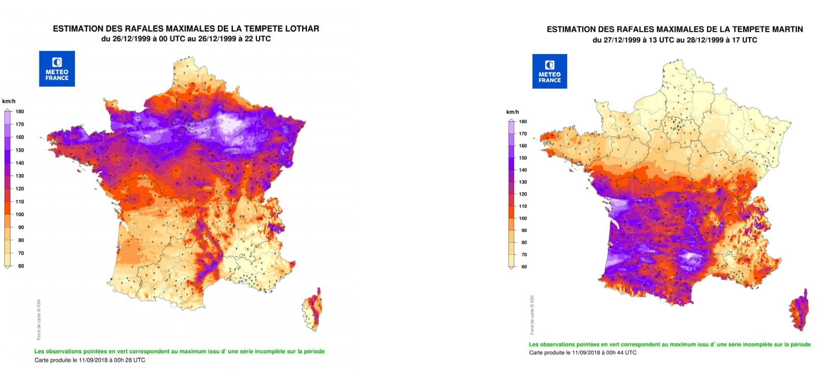 Les tempêtes vont devenir de plus en plus fréquentes dans les prochains mois, celles-ci peuvent atteindre des intensités extrêmes et provoquer des dégâts particulièrement importants et étendus comme ce fut le cas lors des tempêtes Lothar (25-26 décembre 1999) et Martin (27-28 décembre 1999) qui sont les tempêtes de référence en France. Apprenez que le vent avait soufflé jusqu’à 198km/h à Saint-Denis d’Oléron ou encore 173km/h à Saint-Brieux.