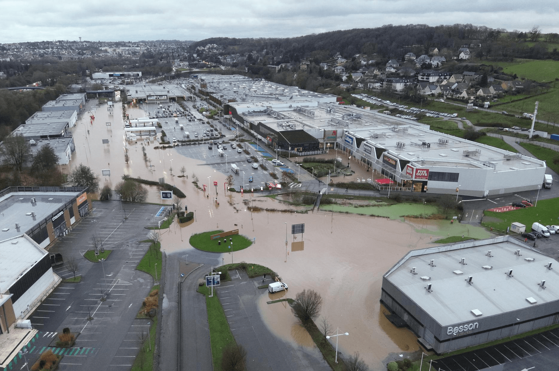 Dans la lignée d'un automne très arrosé, ce début décembre 2023 se montre instable en France. Du 1er au 6 décembre 2023, il est déjà tombé 73 mm de pluie à Biarritz, 58 mm à Quimper, 56 mm à Grenoble ou encore 51 mm à Ajaccio. Entre les journées des lundi 4 et mardi 5 décembre 2023, il est tombé une cinquantaine de millimètres de précipitations dans la région du Havre. Ces précipitations ont généré des inondations localisées mais notables, touchant tout particulièrement la commune de Montivilliers comme le montre le cliché ci-dessous.