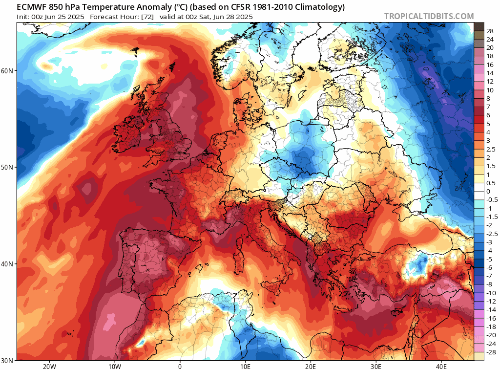 Anomalie thermique de la masse d'air vers 1500m du samedi 27 juin au jeudi 3 juillet 2025 - tropicaltidbits.com