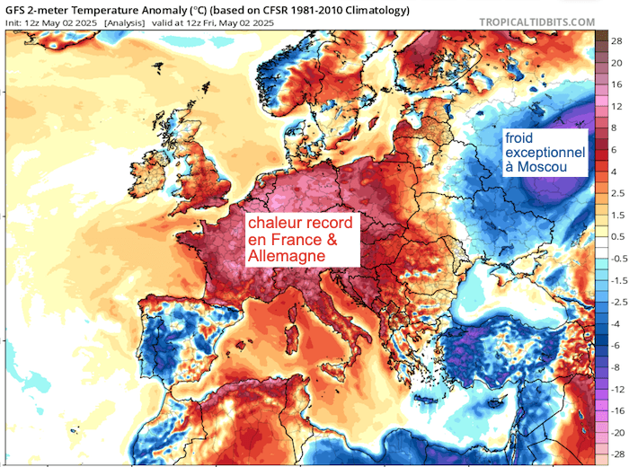 En France et en Allemagne, les températures sont généralement situées 8 à 12°C au-dessus de la normale d’un début de mois de mai, alors que dans la région de Moscou, on est facilement 10 à 12°C en dessous…