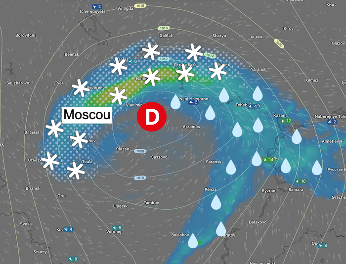 La formation d’une dépression associée à une goutte froide d’altitude dans l’Ouest de la Russie a provoqué des précipitations abondantes sur Moscou (située dans l’occlusion).