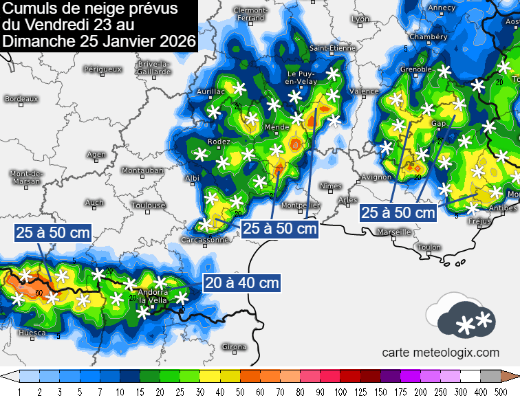 Avec des températures fraîches, une partie de ces précipitations se produira sous forme de neige sur les reliefs. Ce sera particulièrement le cas sur les Pyrénées, le sud du Massif Central et le sud des Alpes où on attend des quantités notables, souvent comprises entre 20 et 40 cm du vendredi 23 au dimanche 25 janvier 2026, parfois 50 cm. Sur les sommets des Cévennes, notamment entre Gard, Lozère et Ardèche, on pourra dépasser les 50 cm. Notons que la limite pluie/neige sera souvent située vers 800-1000 mètres mais pourra s'abaisser ponctuellement plus bas en cas de fortes intensités, par effet d'isothermie.