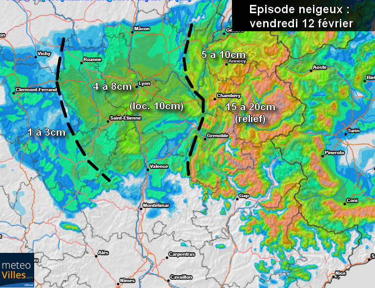 Ces pluies verglaçantes se déplacent en milieu de journée vers le Nord du Massif-Central et vont évoluer vers un épisode neigeux notable sur le Centre-Est du pays en seconde partie de journée. Des quantités importantes sont attendues jusqu'en plaine avec parfois 3 à 7cm sur la région lyonnaise, le Nord de l'Isère. Plutôt 5 à 10cm dans les vallées du Nord des Alpes, dont Grenoble.