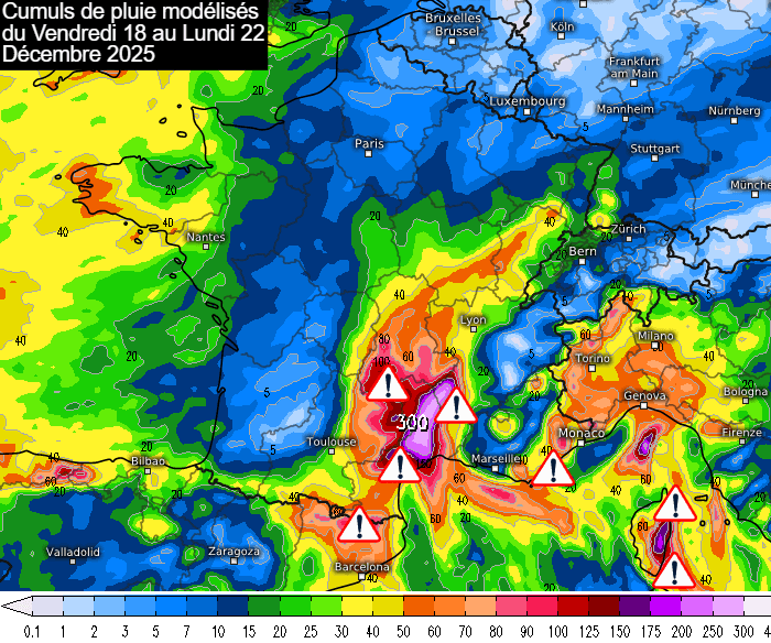 S'il est encore trop tôt pour entrer dans le détail, plusieurs salves pluvio-orageuses actives sont envisagées sur le sud-est de la France dès le vendredi 18 décembre 2025 et jusqu'au lundi 22 décembre. Quatre jours très instables seront donc à surveiller, bien que les modèles divergent quant à la chronologie et à l'intensité de ces précipitations. Le golfe du Lion, le Languedoc, les Cévennes et l'est de la Corse semblent de nouveau les plus exposés avec certaines modélisations envisageant 150 à 300 mm de pluie ! L'est des Pyrénées, la côte d'Azur et le sud des Alpes pourraient aussi être concernés.