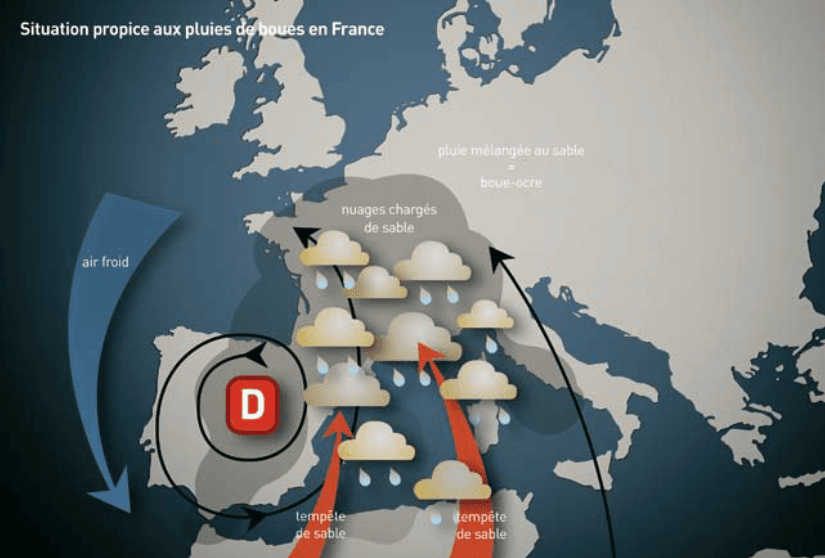 Lorsqu'une dépression vient se creuser et se positionner sur la péninsule Ibérique, un fort vent de Sud peut alors souffler du Sahara vers la France et plus globalement vers tout l'Europe de l'Ouest. En Afrique du Nord, les tempêtes soulèvent d'énormes quantités de sable du désert, qui sont propulsées dans les masses nuageuses voire pluvieuses qui intéressent la France : le ciel prend alors parfois une teinte ocre très inhabituelle, couleur des grains de sable transportés.