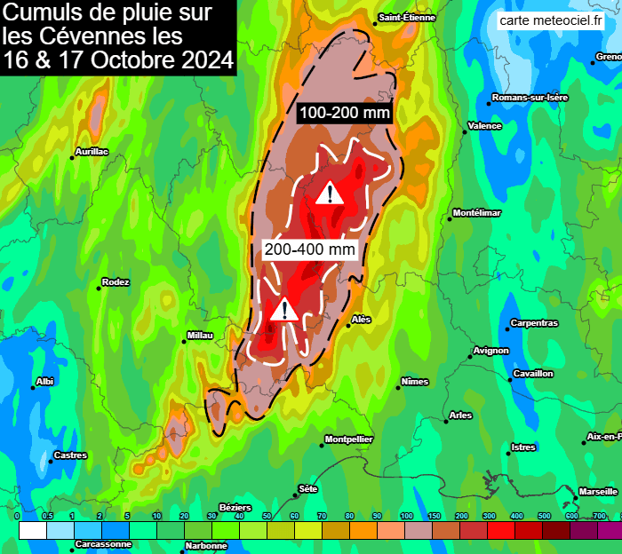 Cumuls de pluie dans les Cévennes les mercredi 16 et jeudi 17 octobre 2024 - meteociel.fr