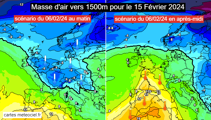 Masse d'air vers 1500m pour le 15 février 2024 selon les scénarios du 6 février au matin et en après-midi - via meteociel.fr