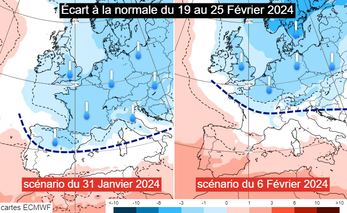 Anomalie thermique du 19 au 25 février 2024 selon les scénarios du 31 janvier et du 6 février - via ECMWF