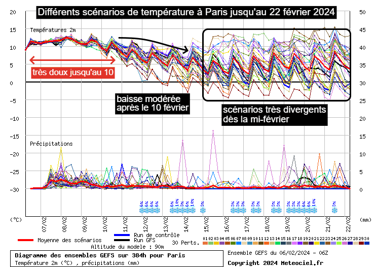 Il suffit de regarder le panel des différents scénarios pour réaliser l'ampleur de l'incertitude sur un potentiel retour du froid la semaine prochaine. Ci-dessous, l'exemple de Paris où l'on note une baisse modérée du thermomètre en début de deuxième décade de février 2024. Notons que la majorité des scénarios ne font que rejoindre les normales de saison et que les scénarios d'un froid vif sont très minoritaires. Dès la mi-février, les incertitudes sont majeures avec des scénarios hivernaux comme des scénarios printaniers... La moyenne reste cependant autour de valeurs proches des normales.