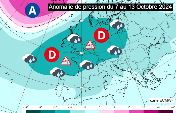 Anomalie de pression en semaine du lundi 7 au dimanche 13 octobre 2024 - ECMWF