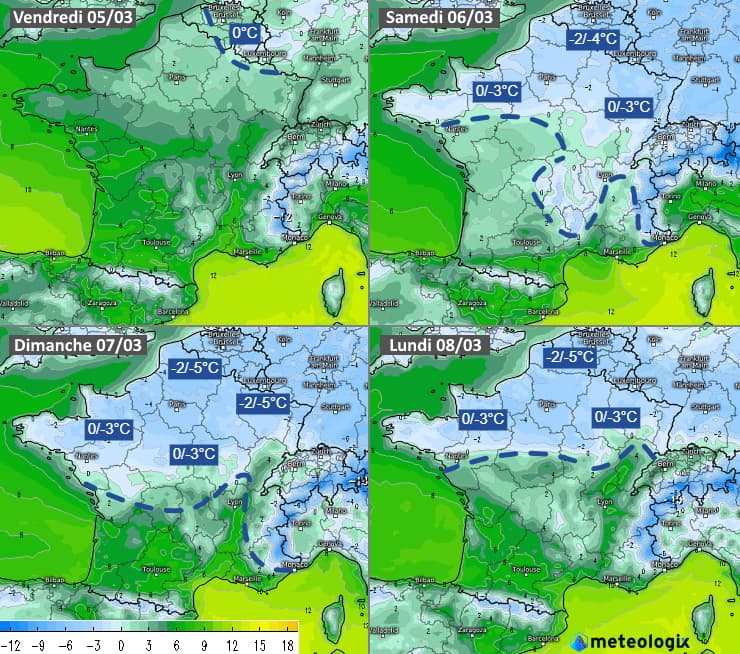 La bascule du flux au secteur nord à nord-est apporte une masse d'air plus froid qui concernait déjà l'extrême nord de la France jeudi 4 mars et qui s'étendra à toute la moitié nord en fin de semaine.