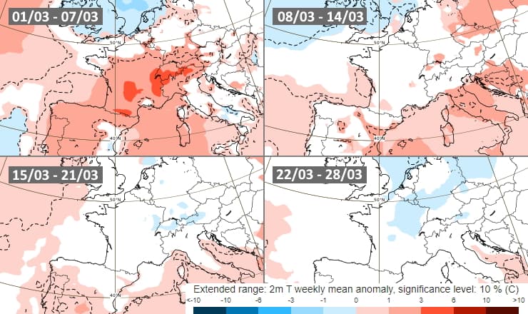 Malgré le rafraîchissement des prochaines heures, cette première semaine de mars se montre nettement plus douce que la normale. Le modèle européen envisage un retour à des valeurs plus proches des normales pour les trois prochaines semaines de mars 2021. De légères anomalies fraîches sont même modélisées pour la fin du mois en allant vers le nord-est de la France.