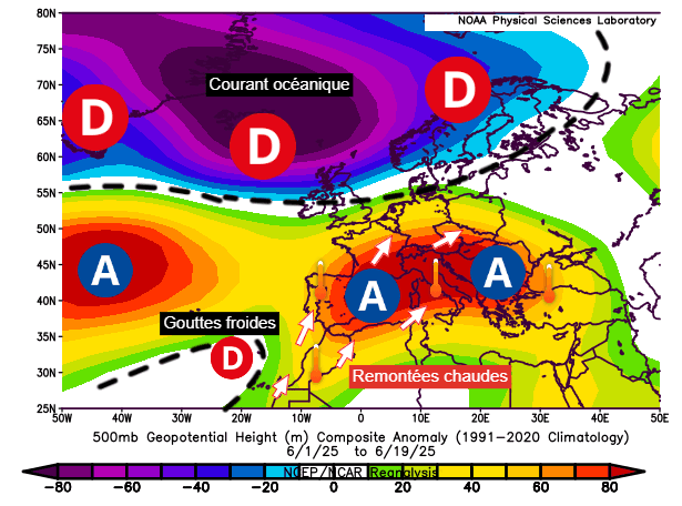 En effet, les masses d'air très chaudes n'ont pas de difficultés à remonter du nord de l'Afrique vers la France depuis maintenant plusieurs semaines, notamment en raison de l'isolement récurrent de gouttes froides au large du Portugal, faisant office de pompe à chaleur pour l'ouest de l'Europe. Cette récurrence est d'ailleurs bien visible sur les anomalies de géopotentiels depuis le début du mois de juin.