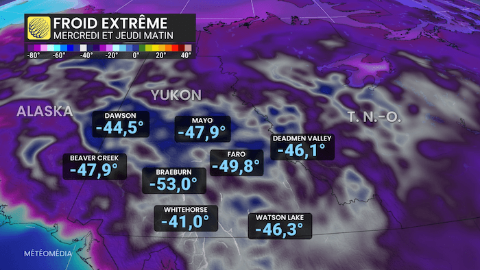 Le Canada a franchi un seuil glacial ce mercredi avec ses premières températures sous les -50 °C, enregistrées au Yukon (Nord-ouest du pays). Mercredi matin, le thermomètre est descendu jusqu’à -53 °C à Braeburn, au Yukon. Il s’agit de la température la plus basse observée au pays depuis le début de l’hiver, en valeur réelle et non en ressenti. Un tel niveau de froid aussi tôt dans la saison n’avait plus été atteint depuis trois décennies. La dernière occurrence comparable remonte au 5 décembre 1995, lorsque la localité de Ross River avait elle aussi enregistré -53 °C.
