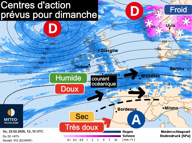 Centres d'action prévus pour la journée de dimanche - modèle météo européen - carte retraitée par Wetteronline et Meteo-villes