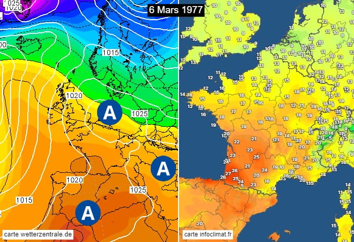 Situation et températures maximales relevées le 6 mars 1977 - via wetterzentrale.de et infoclimat.fr