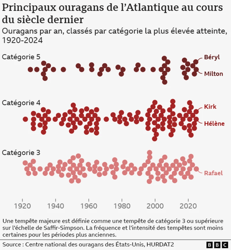 Fréquence des ouragans de catégorie 3, catégorie 4 et catégorie 5 sur l'Atlantique depuis un siècle - BBC