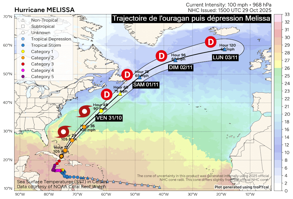 Trajectoire de l'ouragan puis dépression Melissa jusqu'au lundi 3 novembre 2025 - polarwx.com