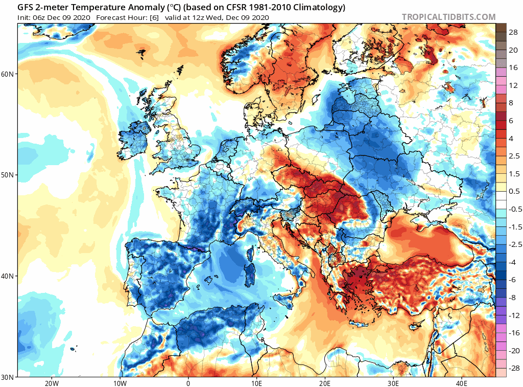 Écart thermique à la normale des températures au sol du 9 au 16 décembre 2020 - via tropicaltidbits.com
