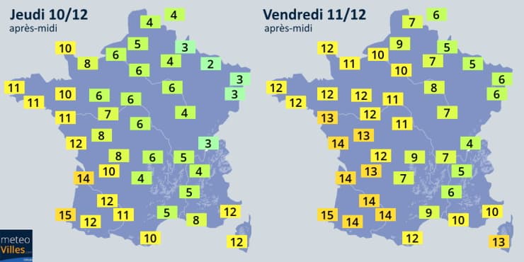 Températures maximales prévues les jeudi 10 et vendredi 11 décembre 2020 - Météo Villes