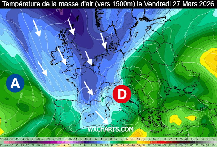 Température de la masse d'air vers 1500m prévue le vendredi 27 mars 2026 - wxcharts.com