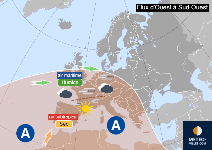 Schéma d'une situation anticyclonique entraînant un flux d'ouest à sud-ouest en France - Météo Villes