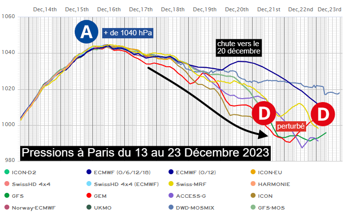 Évolution de la pression à Paris du 13 au 23 décembre 2023 - graphique meteologix.com