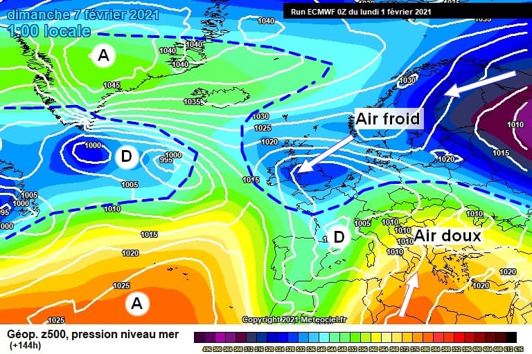 Schéma de la situation sur l’Ouest de l’Europe (scénario du modèle CEP) pour dimanche 7 février – via météociel.fr