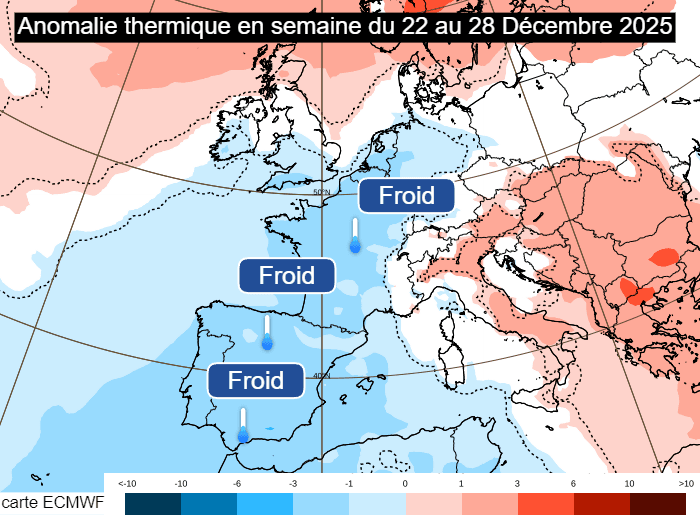 Anomalie thermique prévue en semaine du lundi 22 au dimanche 28 décembre 2025 - ECMWF
