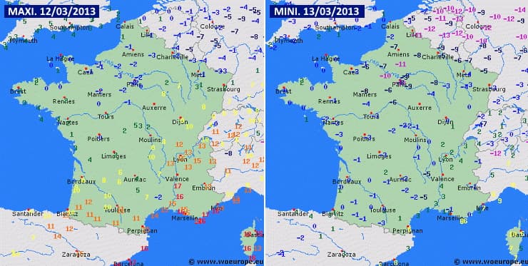 Températures maximales du 12 mars et minimales du 13 mars 2013 - via woeurope.eu