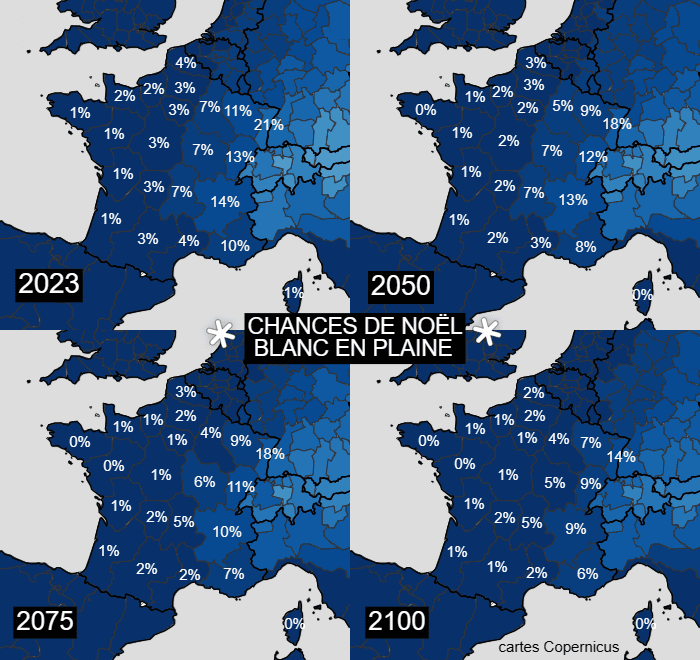 Avant l'accélération du réchauffement à compter des années 1980, il y avait environ 1 Noël blanc sur 5 dans le nord et l'est de la France. Depuis, les probabilités ont bien diminué. L'agence européenne Copernicus indique que les chances de vivre un Noël blanc de nos jours ne sont plus que de 3% en Île-de-France, 7% en Auvergne, Bourgogne et Champagne, 14% sur Rhône-Alpes et 21% en Alsace. D'ici la fin du siècle - en prenant en compte un scénario médian de réchauffement - cette probabilité serait quasi-nulle en Île-de-France (1%) et tomberait à 9% sur Rhône-Alpes et 14% en Alsace.