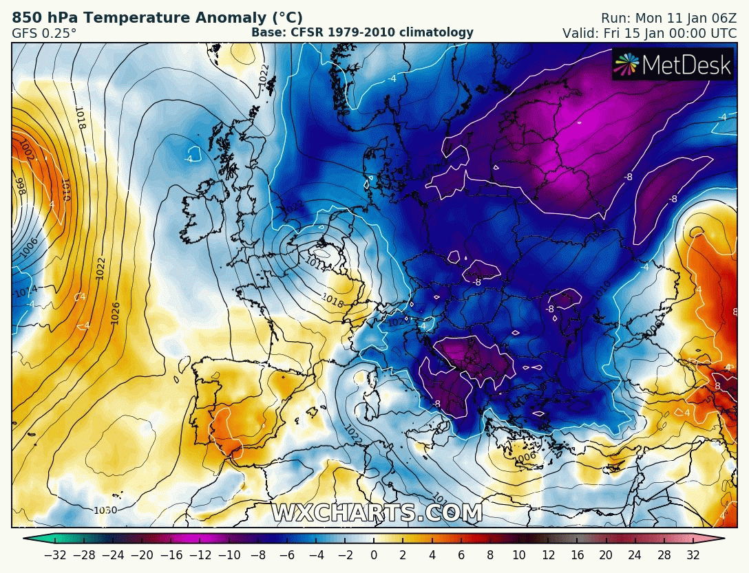 Animation des anomalies de températures à 850hPa entre le jeudi 14 et le lundi 18 janvier – Modèle GFS via WX CHARTS
