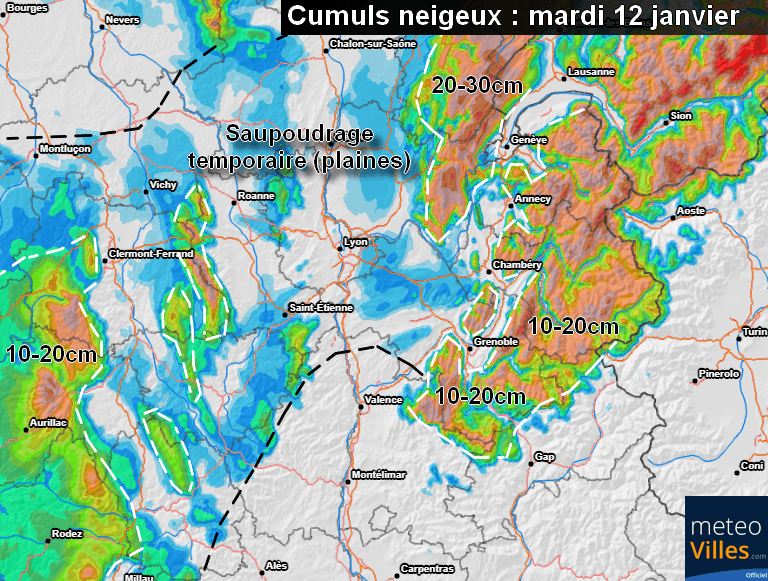 L’air océanique devrait peu à peu prendre le relais par la suite, annihilant tout risque de neige en plaine dès la nuit suivante ainsi que pour la journée de mercredi 13 janvier. Les précipitations neigeuses devraient néanmoins se poursuivre au-dessus de 1200-1300m d’altitude avec 10-20cm supplémentaires sur le Nord des Alpes.