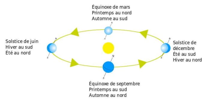 Schéma expliquant la position de la Terre lors des équinoxes et solstices - via Wikipedia